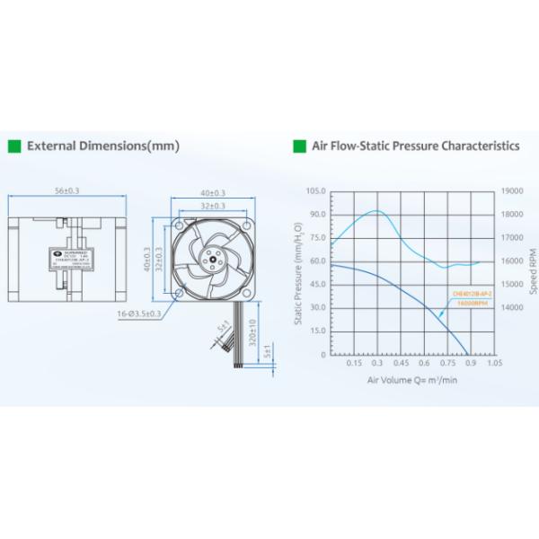| Model | Rated Voltage (DCV) | Operating Voltage (DCV) | Rated input (W) | Rated Current (A) | Operating Temperature (°C) | Storage Temperature CQ | Speed (RPM) | Max, Air Flow (CFM) | Max, Aire Pressure (mmHQ) | Noise (DB) | Bearing Type | Weight (g) |